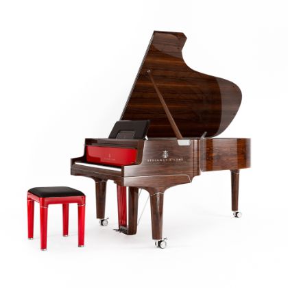 This exclusive Gran Nichetto Limited Edition piano is featured as a Model B in Midnight Red with hand-selected macassar ebony accents. This version features brass hardware.