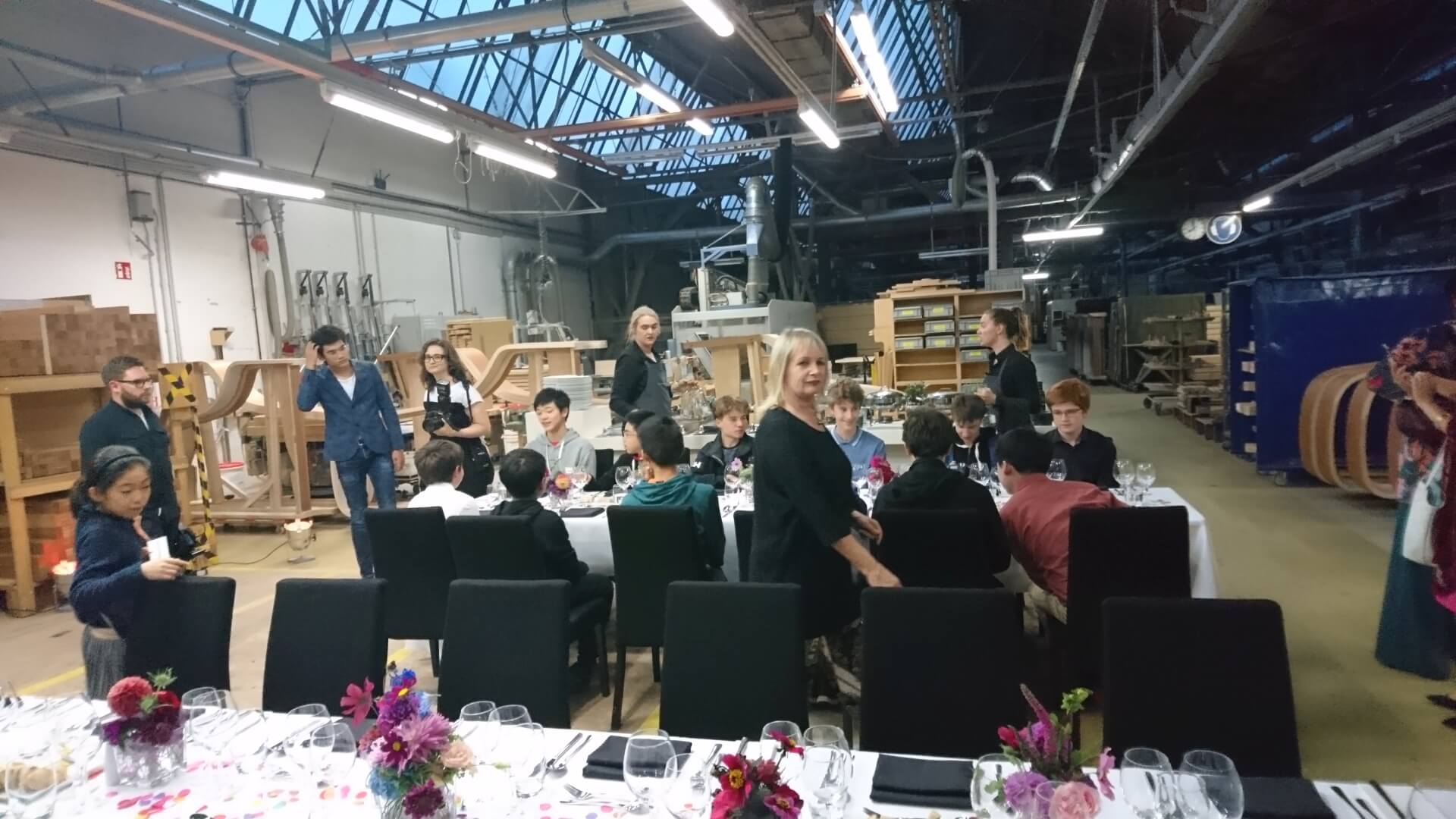夜: スタインウェイ工場内での夕食会。スタインウェイピアノのリム(側板)が並ぶ傍で食事をするという特別なシチュエーションの中、参加者の若者たちの興味はやはりピアノを弾くこと。皆で仲良くピアノを弾きあって過ごしていました。