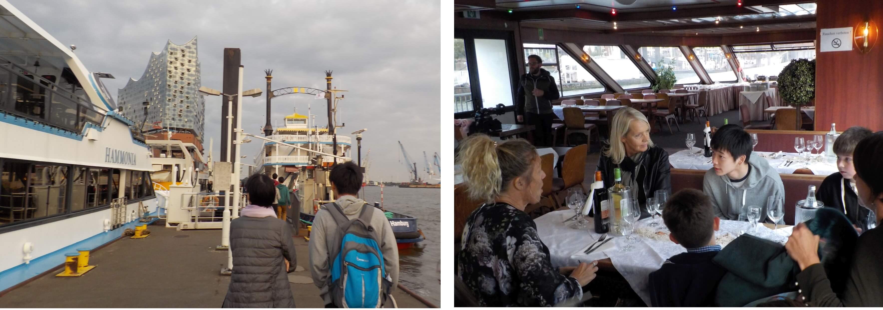夜: 多国籍の参加者全員でハンブルクの港へ。クルーズ船での夕食会。2017年にオープンしたエルプフィルハーモニーの前を通って大きなコンテナが並ぶ埠頭やハンブルクの夜景を楽しみました。