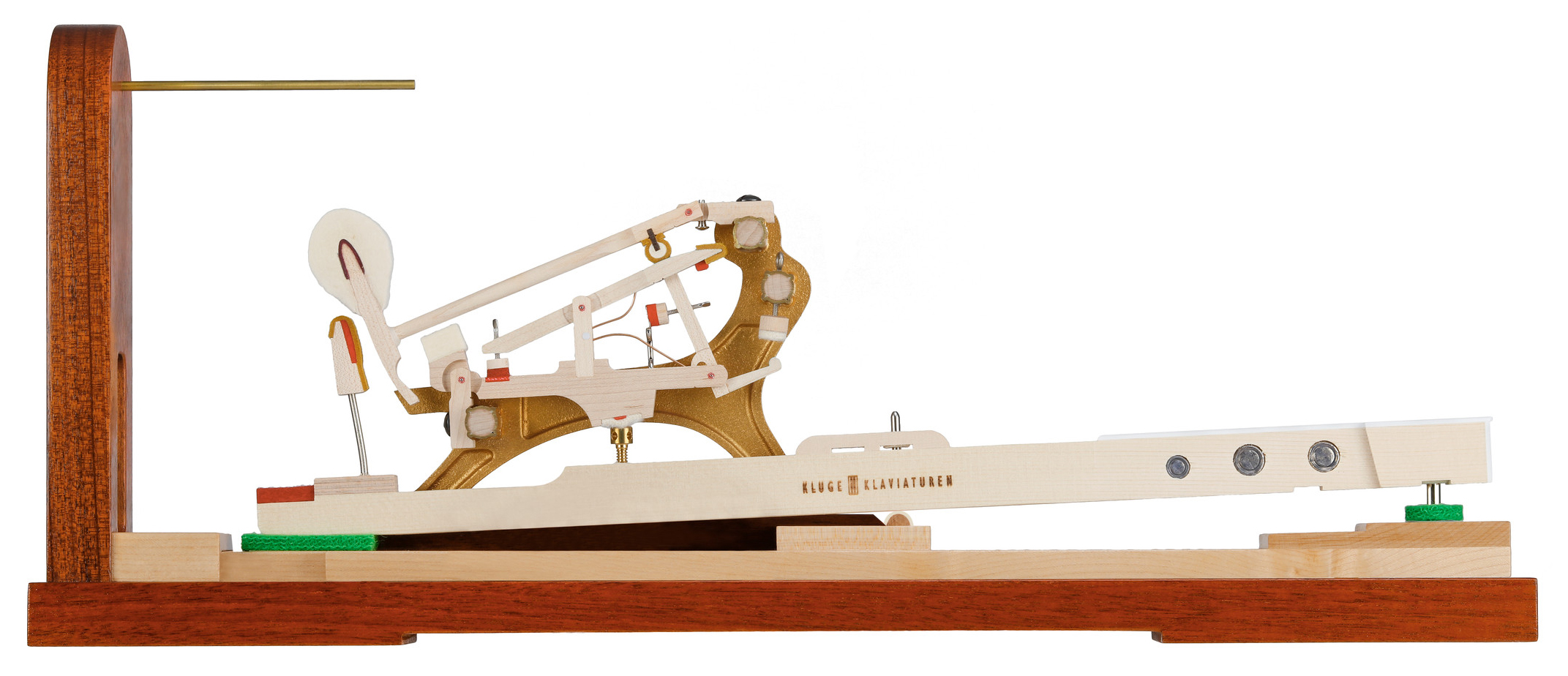 The patented brass “Tubular Metallic Action Frame” with rosette-shaped rails and flanges, bronze action brackets, as well as the let-off regulating screw loop, appeared for the first time in this model. The metallic frame resists climate changes, while the rosette rails and flanges automatically align the action parts upon tightening of the flange screws.